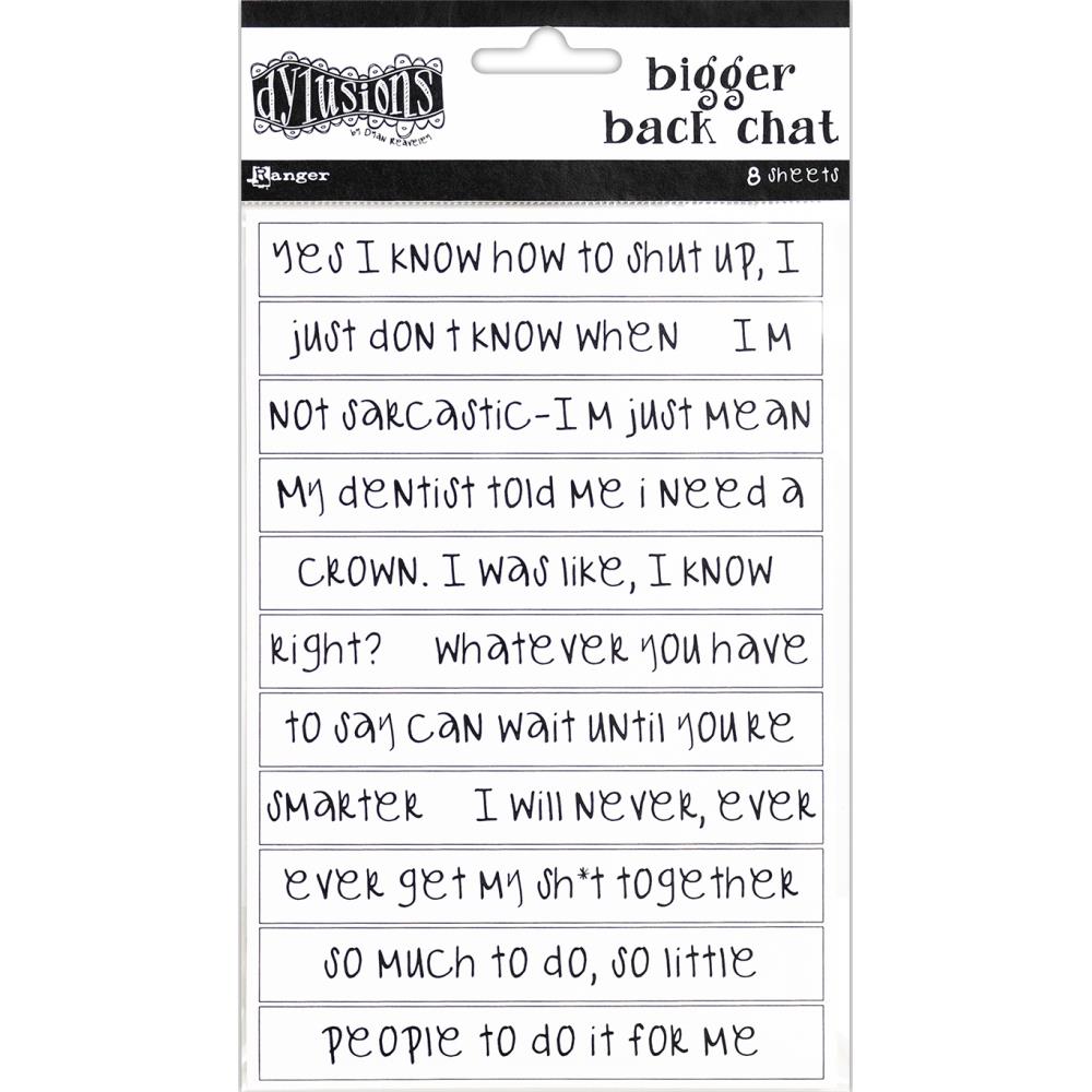 Von Dylusion/Dyan Reaveley’s aus der „Bigger Back Chat“ Reihe kommt dieses Paket mit 8 Stickerbögen mit verschiedenen Sätzen. Die Sticker haben einen weißen Hintergrund mit schwarzer Schrift.